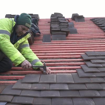 Moving onto the tiling, we were able to mark the roof out before the loading and subsequent tiling process could begin. It was important that at this point that quality was the focus, rather than speed. Tiles began to be laid and were fixed twice at perimeters and on each fifth course using copper clout nails. Details were completed one by one by our talented tradesmen, recreating the roofs former glory. In unison with careful construction of the ‘details’, fellow team members tiled the larger sections of open roof.