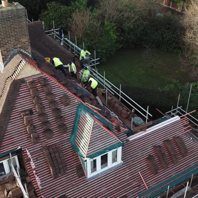 Work soon commenced on site with the erection of a perimeter eaves level scaffold by our in-house scaffold team. Skips were then delivered before our tiling teams successfully stripped (removed) the roof covering. Due to ‘delamination’ of the tiles, there was no salvage, resulting in all tiles being placed in our hardcore skip. It is common practice for our operatives to segregate waste into hardcore, timber, metal and non-recycling skips in attempt to recycle as much as possible.